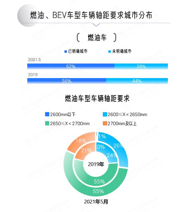 2.軸距要求:新能源車的軸距要求低于與燃油車,主要集中在2600mm-2650mm,燃油車要求在2700mm以上的比例較高。