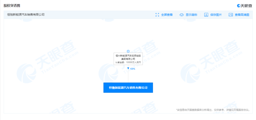 天眼查官網(wǎng)股權(quán)穿透顯示,該公司由恒大新能源汽車投資控股集團(tuán)有限公司100%控股。