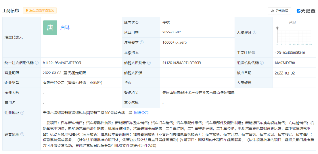 天眼查官網(wǎng)顯示,3月2日,恒馳新能源汽車銷售有限公司成立,法定代表人為唐琳,注冊資本1億元,經(jīng)營范圍包含:新能源汽車換電設(shè)施銷售;充電樁銷售;電動汽車充電基礎(chǔ)設(shè)施運營;網(wǎng)絡(luò)預(yù)約出租汽車經(jīng)營服務(wù)等。