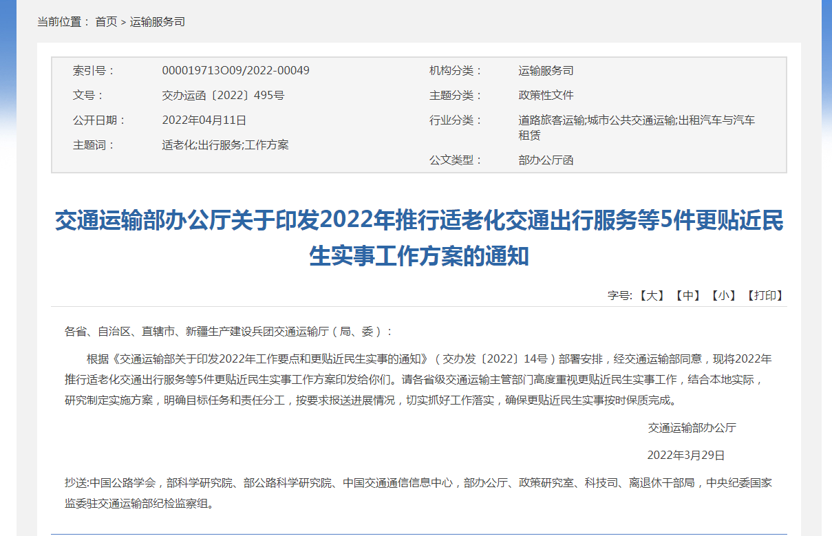 Ptaxi猿著網約車系統(tǒng)開發(fā)獲悉交通運輸部辦公廳關于印發(fā)2022年推行適老化交通出行服務等5件更貼近民生實事工作方案的通知,下圖為具體通知內容