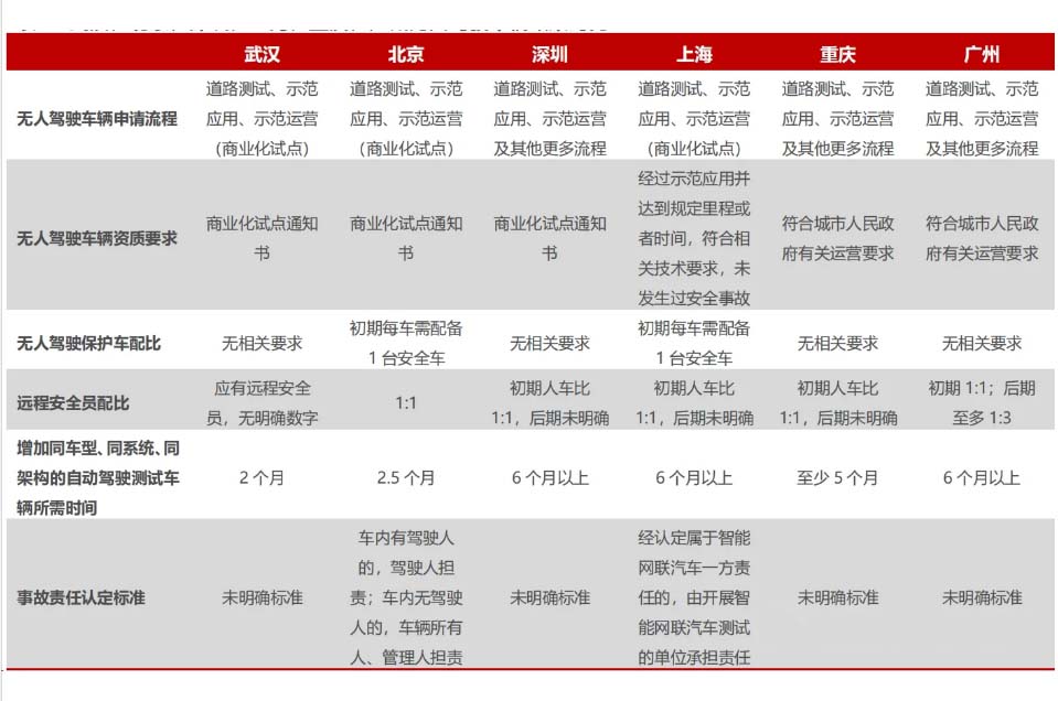 各地?zé)o人駕駛車輛政策存在較大差異,便利化為發(fā)展趨勢。相較于上海、廣州、深圳和重慶,武漢、北京的無人駕駛車輛申請相關(guān)政策更為便利:1)無人駕駛車輛申請流程:北京、上海、武漢三地只需經(jīng)過道路測試、示范應(yīng)用、示范運(yùn)營三個(gè)步驟,較廣州、深圳、重慶永川更為簡化;2)資質(zhì)要求:北京、武漢和深圳的相關(guān)企業(yè)獲得商業(yè)化試點(diǎn)通知書即可開展無人駕駛收費(fèi)服務(wù),但在廣州和上海相關(guān)政策更為復(fù)雜;3)無人駕駛保護(hù)車配比:武漢、廣州、深圳及重慶沒有相關(guān)要求,上海以及北京的政策要求初期每車需配備1臺安全車;4)遠(yuǎn)程安全員配比:六個(gè)城市均要求初期至少達(dá)到1:1的人車比;5)增加同車型、同系統(tǒng)、同架構(gòu)的自動駕駛測試車輛所需時(shí)間,武漢和北京僅需2個(gè)月左右即可實(shí)現(xiàn)無人化商業(yè)試點(diǎn)應(yīng)用,而其他城市的申請周期則較長通常需要5個(gè)月及以上;6)事故責(zé)任認(rèn)定標(biāo)準(zhǔn):北京、上海要求無人駕駛下的事故均需智能網(wǎng)聯(lián)測試的單位擔(dān)責(zé)。當(dāng)前,中國自動駕駛正處于快速發(fā)展階段,各地政策預(yù)計(jì)會逐步便利化。