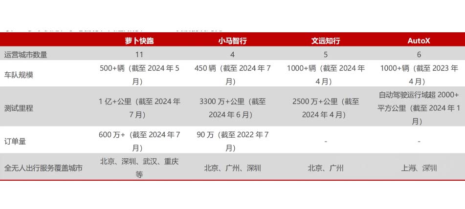1)蘿卜快跑已經(jīng)于武漢、北京、深圳等11個(gè)城市開放載人測試運(yùn)營服務(wù),截至24年5月,已在武漢投放超500輛無人車,截止24年7月,測試?yán)锍坛?億公里,訂單量超600萬;