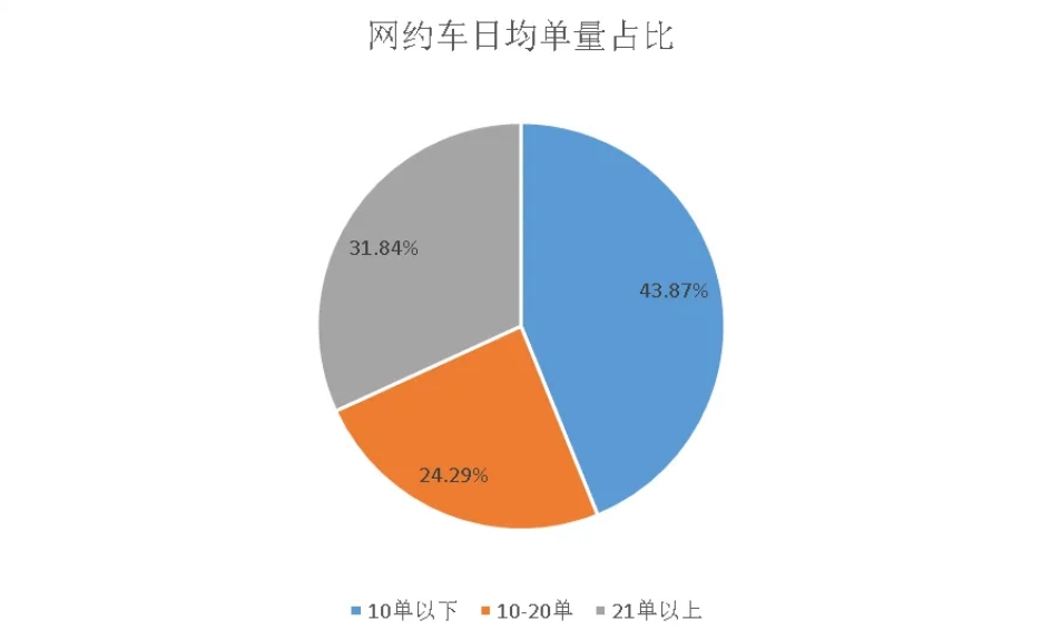 從單車日均訂單數(shù)量分布來看,少于10單的網(wǎng)約車占比43.87%;10至20單區(qū)間的占比24.29%;21單及以上的占比31.84%。